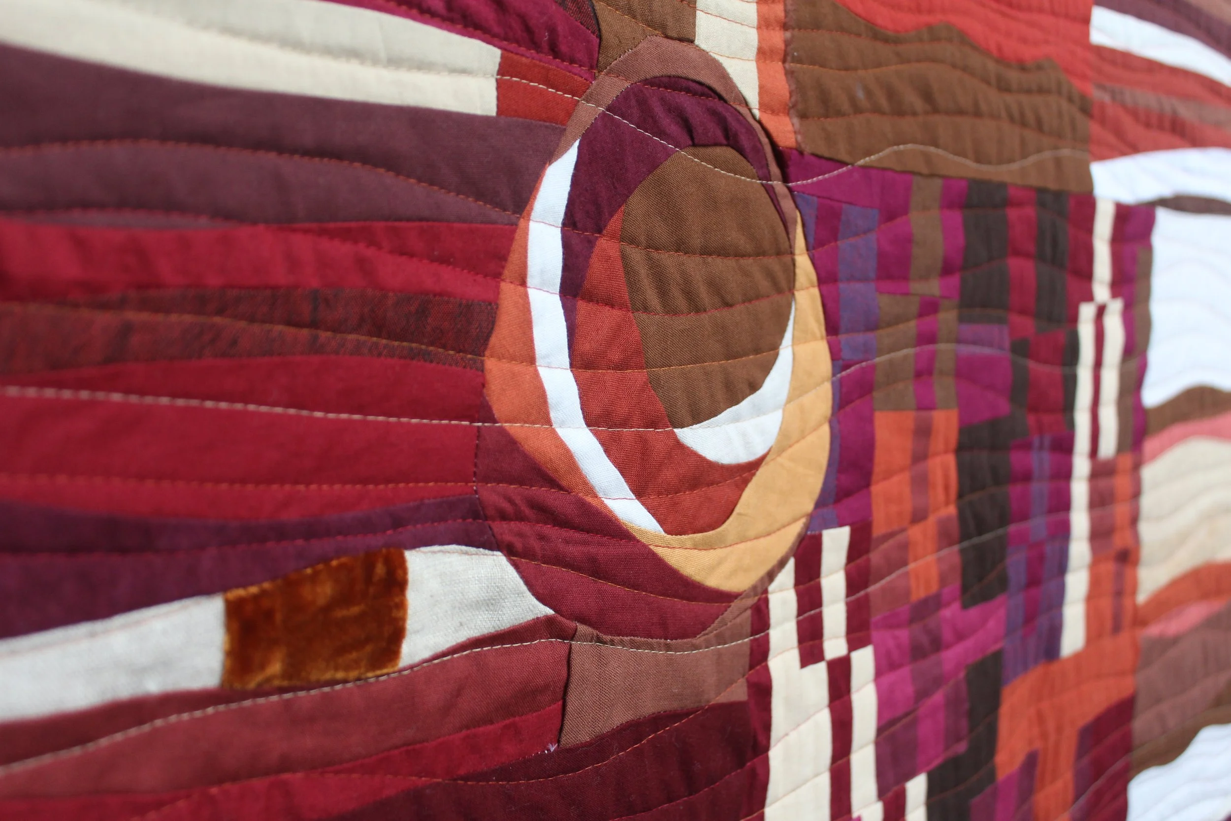 Inspiration: “Bacon” may be a strange block prompt, but my beemates understood that a food item was a good fit for “A Quilter’s Table.” Given the freedom to use a mix of fabrics in their blocks, they included velvet, shot cotton, linen, raw silk,, hand-dyes, suede, quilter’s cotton, and even fuzzy selvages. My circle-like pancetta blocks brought everything together.
