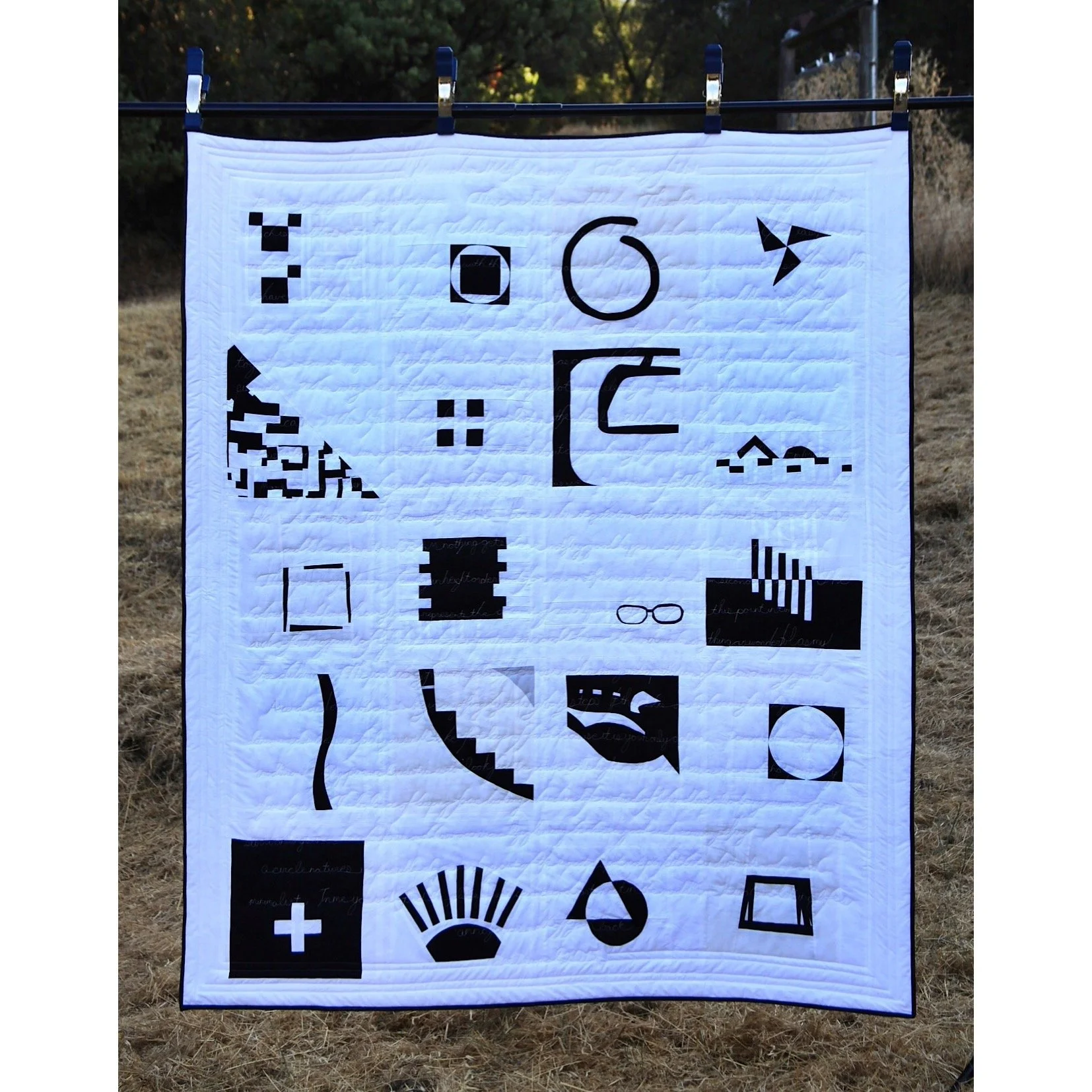 Inspiration: “What I ask of my Beemates is to make two distinct quilt blocks no bigger then 10.5 x 10.5 inches (I need even more negative space for this quilt I envision). I want each of you to use black and white fabric (and I use those terms a little loosely because there are obviously many versions of black and white. Adding variety adds some depth in my opinion). Make a design that highlights the importance of negative space (some things are better left unsaid) and lastly make each design mean something. Perhaps the design is a reflection of your place in the world, your child, family, recent notable event, favorite joke . . . The meaning doesn’t have to be serious and you don’t need to share it (though I would love it if you did). In my opinion infusing our makes with meaning steps our making up a notch so spend a little time pondering why and what your block means about YOU.”